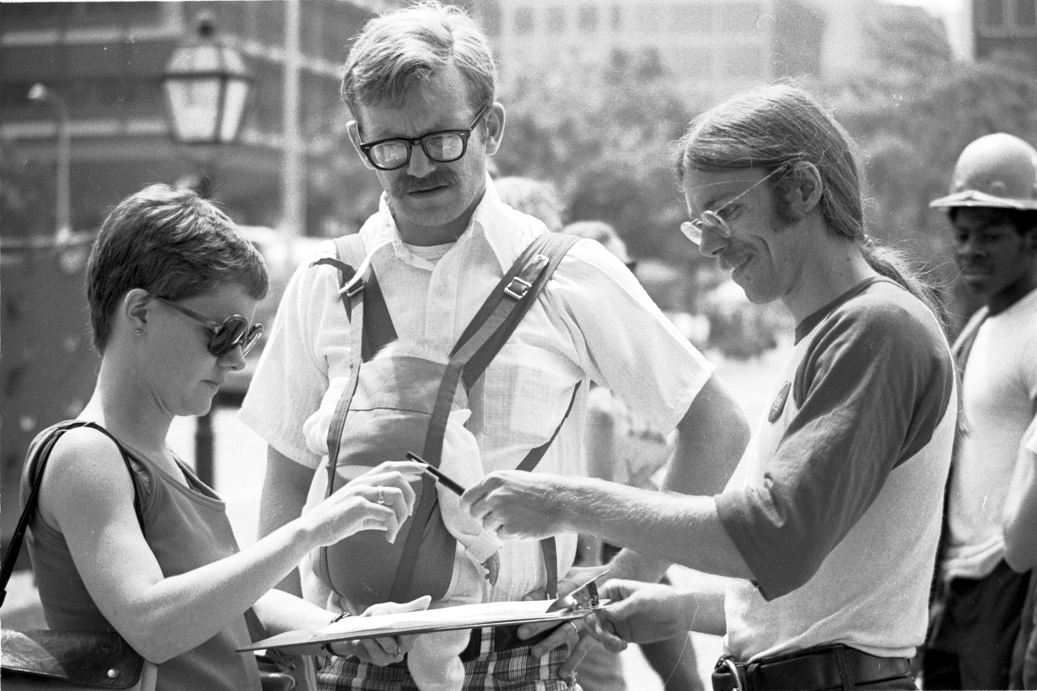 Pictured: Harry Langhorne (right) getting signatures in support of gay rights bill before Philadelphia City Council, at Philadelphia Pride March, Independence Mall, 1973