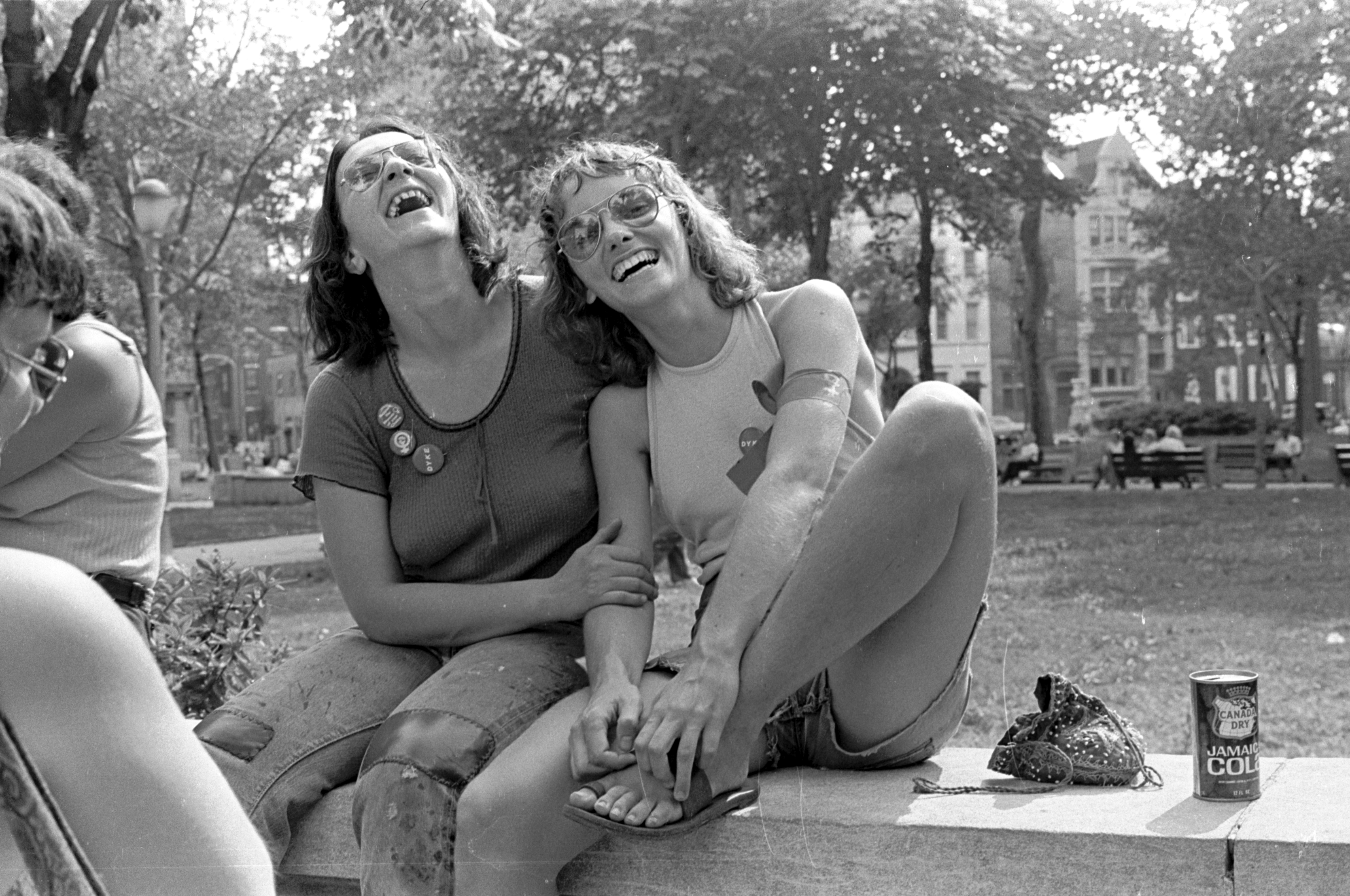 Pictured: Arleen Olshan (left) and Barbara Bjanes (right) sitting on balustrade at women's demonstration at Rittenhouse Square, circa 1972.