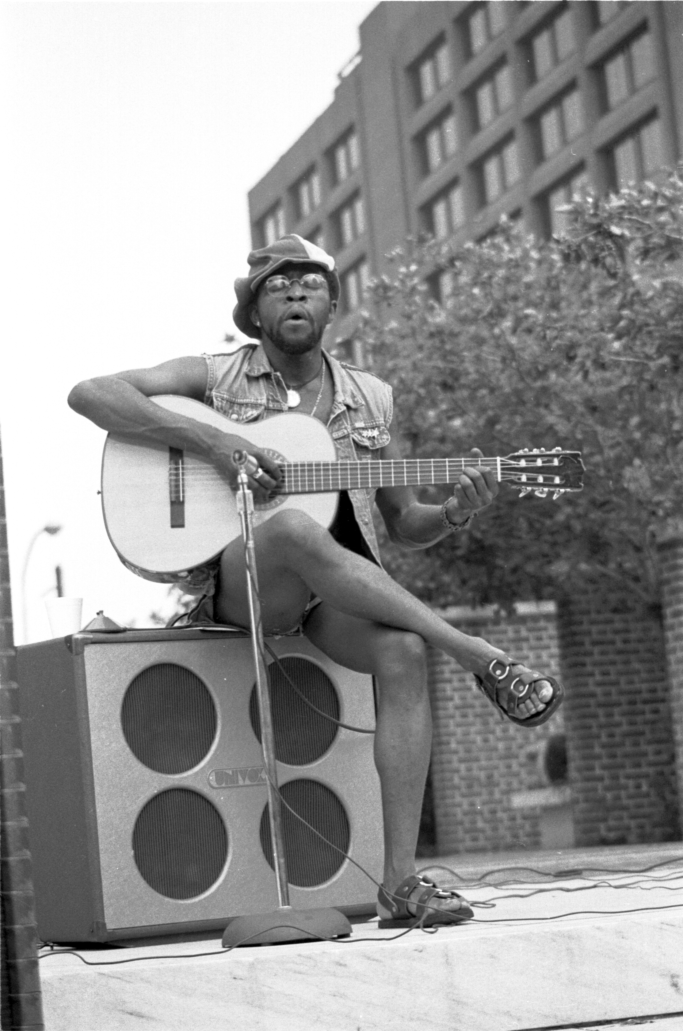 Pictured: John Stevens Powell, known as "Saj" for Sagittarious, sings and plays guitar at the Philadelphia Pride March at Independence Mall, 1973.
